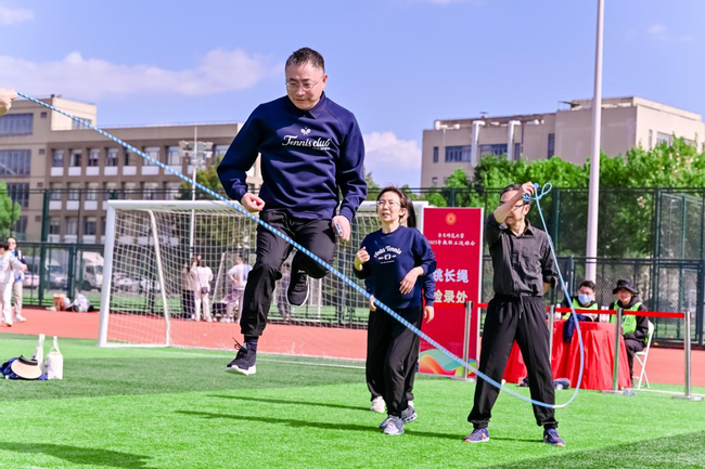 跳长绳比赛中,何高奇、吕紫瑄、杨文彧、韩璐、塔维娜、徐飞、邵非、舒翔、刘丽群、余佳等老师组成队伍,摇绳和跳跃配合有序,顺利冲进复赛,展现了良好的节奏感和团队协作能力。